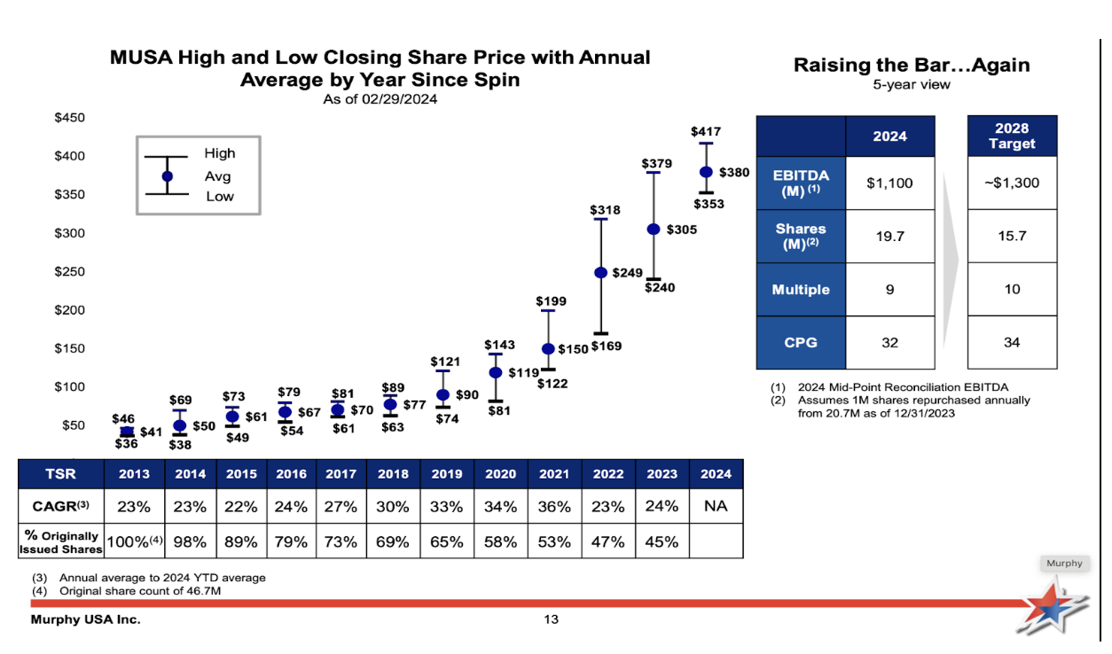 Murphy USA has also bought back more than 55% of shares outstanding over the past decade. |