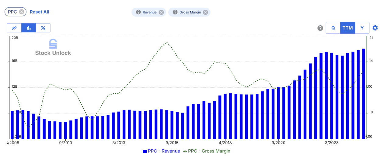 Pilgrim’s Pride produces and distributes chicken and pork products to customers all around the world. The business model is un-sexy but remarkably stable (in terms of revenue, profitability fluctuates more with commodity prices) and difficult to compete with at scale as the demand for cheap protein will continue to rise. |