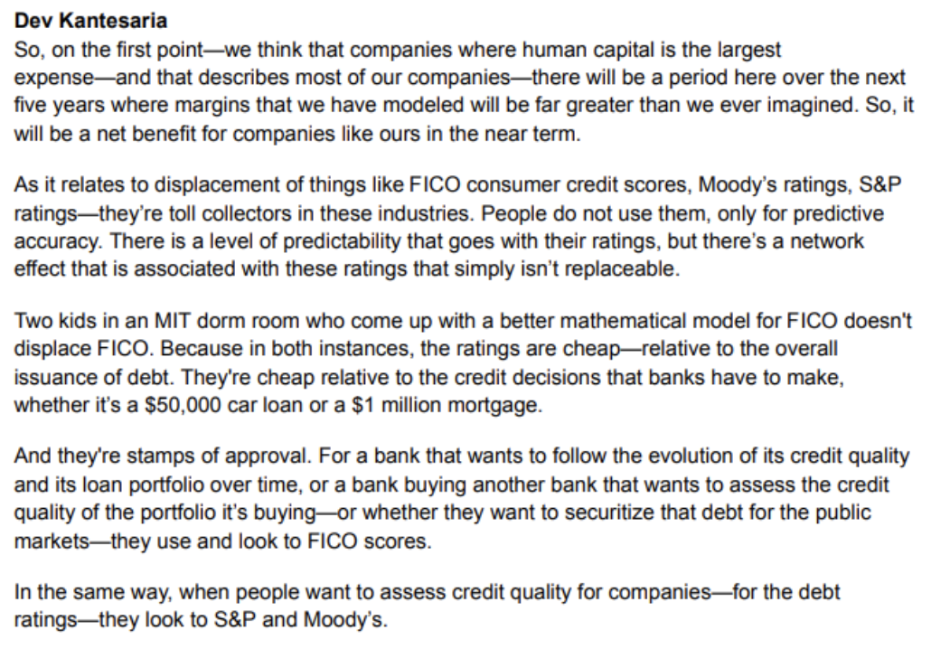 Here is what legendary investor Dev Kantesaria said about how AI will affect $FICO $SPGI $MCO: