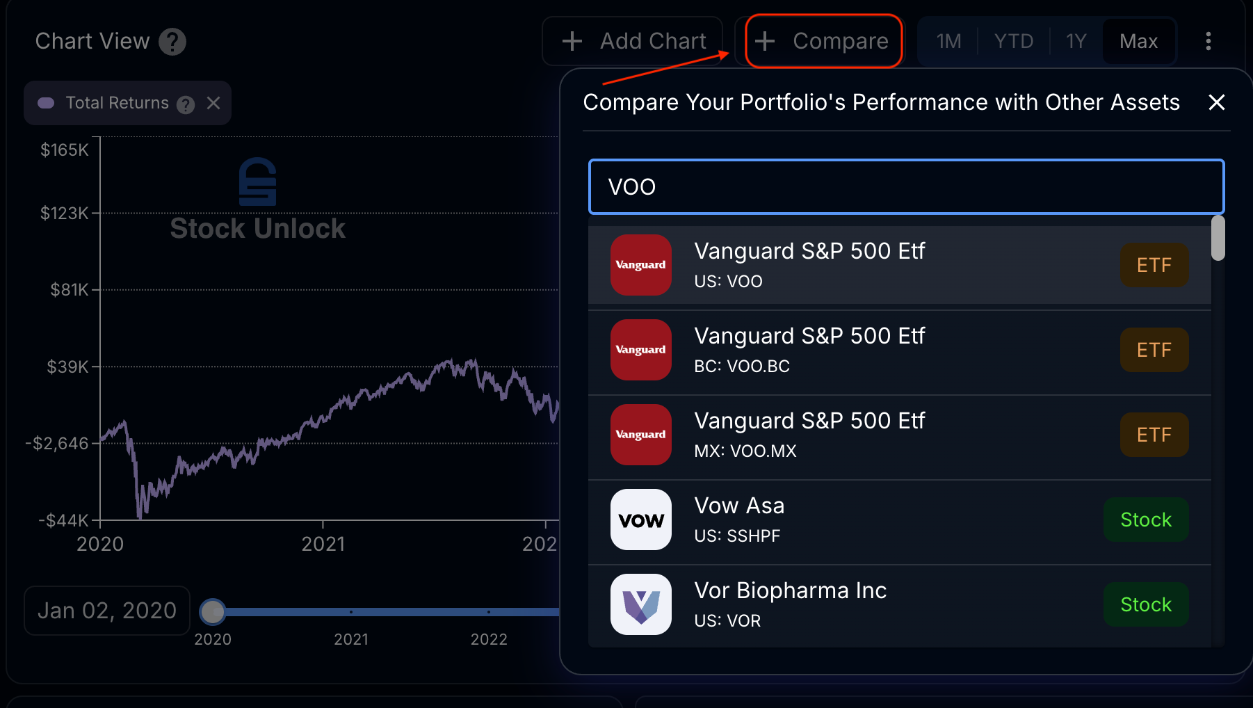 We just shipped a highly requested upgrade to the Stock Unlock web app. You can now compare your portfolio’s performance against any stock or ETF, directly inside your portfolio chart. What’s new: - Benchmark your portfolio against SPY, QQQ, VOO, or any ticker